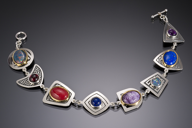 charoite, 7mm fire opal, 14/10mm denim lapis, 7mm amethyst. Lobster claw clasp.