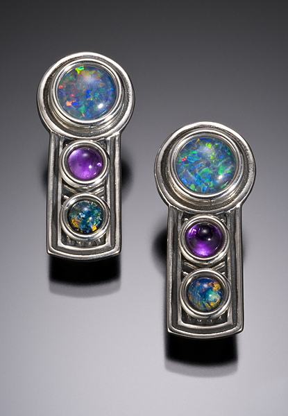 K103P3Size: 1” H x 3/8” W Sterling silver earrings shown with 7mm fire opal, 4mm amethyst and 4mm fire opal. Surgical steel posts. Sterling silver earwires available. See stone chart for available stones. $169.00 |
