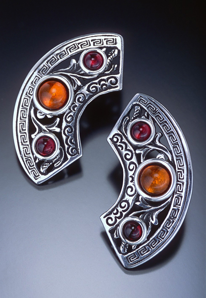 K115P3Size: 1 ½” H x 9/16” W Sterling silver earrings shown with 4 mm garnet, 7 mm amber and 4 mm garnet. Sugical steel posts only. See stone chart for available stones. $179.00 |