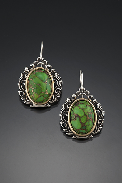 K121DSize: 7/8” H x 3/4" W Sterling silver shown with 14/10 bronze green turqouise in brass bezels. Sterling silver earwires. Surgical steel posts available. See stone chart for available stones. $139.00 |