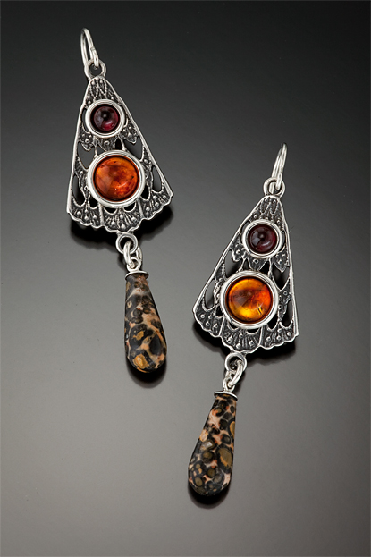 Sterling silver shown with 4mm garnet, 7mm amber and jasper drop. Surgical steel posts available.