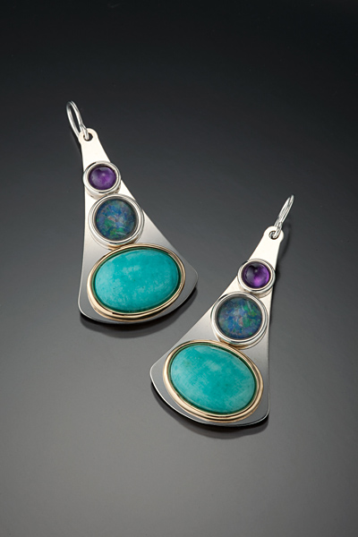 S35D3Size: 1 1/8” H x 13/16 ” W Sterling silver shown with 4mm amethyst, 7mm opal and 14/10 amazonite in a brass bezel. Available with surgical steel posts also. See stone chart for available stones. $179.00 |