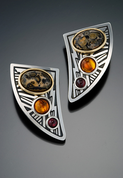 S62P3Size:1 ¼” H x 7/8” W Sterling silver earrings shown with 14/10 mm leopard skin jasper in brass bezel, 7 mm amber and 4 mm garnet. Surgical steel posts. Sterling silver earwires available. See stone chart for available stones. $179.00 |
