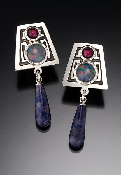 S94P3Size: 1 ½” H x 11/16” W Sterling silver earrings shown with 4 mm amethyst, 7 mm fire opal and sodalite drop. Surgical steel posts. Sterling silver earwires available See stone chart for available stones. $179.00 |