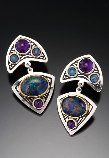 Sterling silver earrings shown with 7 mm amethyst, 4 mm fire opals, 14/10 mm fire opal in brass bezel and 4 mm amethyst. Surgical steel posts only.