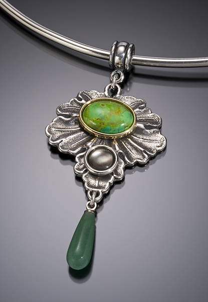 BP97P3Size: 2” H x 11/4” W Description: Sterling silver shown with green turquoise with brass bezel, 7mm. black mother of pearl and jade drop. See stone chart for available stones. $198.00 |
