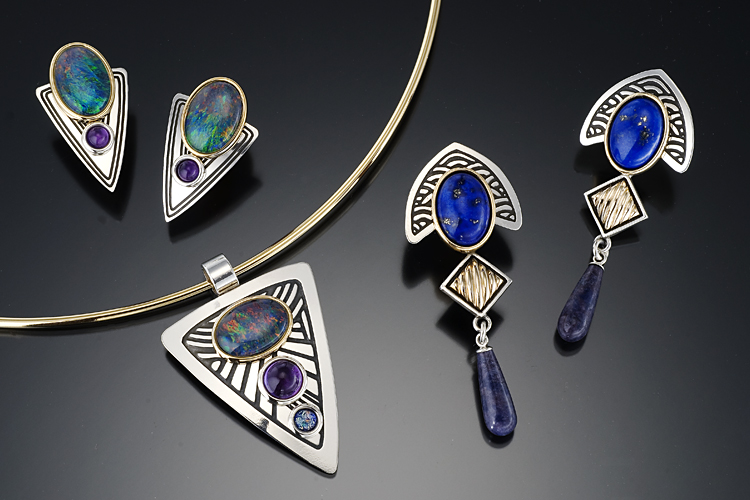 Postcard 14S108P2 (earrings, left)Size: 13/16” H x 11/16” W Sterling silver earrings shown with 14/10 mm fire opal and 4 mm amethyst. Surgical steel posts only. See stone chart for available stones. $169.00S99P3 (earings, right)Size:2” H x 7/8” W Sterling silver earrings shown with 14/10 mm lapis in brass bezel, 14K gold filled accent and sodalite drop. Surgical steel posts only. See stone chart for available stones. $179.00P60P3N (necklace)Size: 1 ¾” H x 1 ¼” W Sterling silver necklace shown with 14/10 mm fire opal in brass bezel, 7 mm amethyst and 4 mm fire opal. See stone chart for available stones. $179.00 |