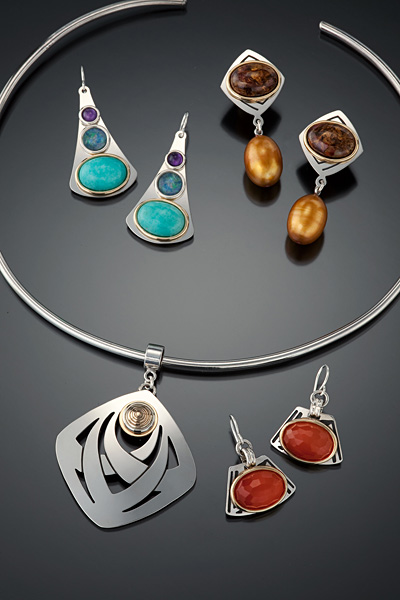 Sterling silver shown with 14/10 pietersite and 5/8 golden pearl. Surgical steel posts. Available with sterling silver wires also.