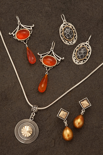 Sterling silver shown with 14/10 faceted carnelian in a brass bezel with 3/4 faceted carnelian drop. Sterling earwires only.